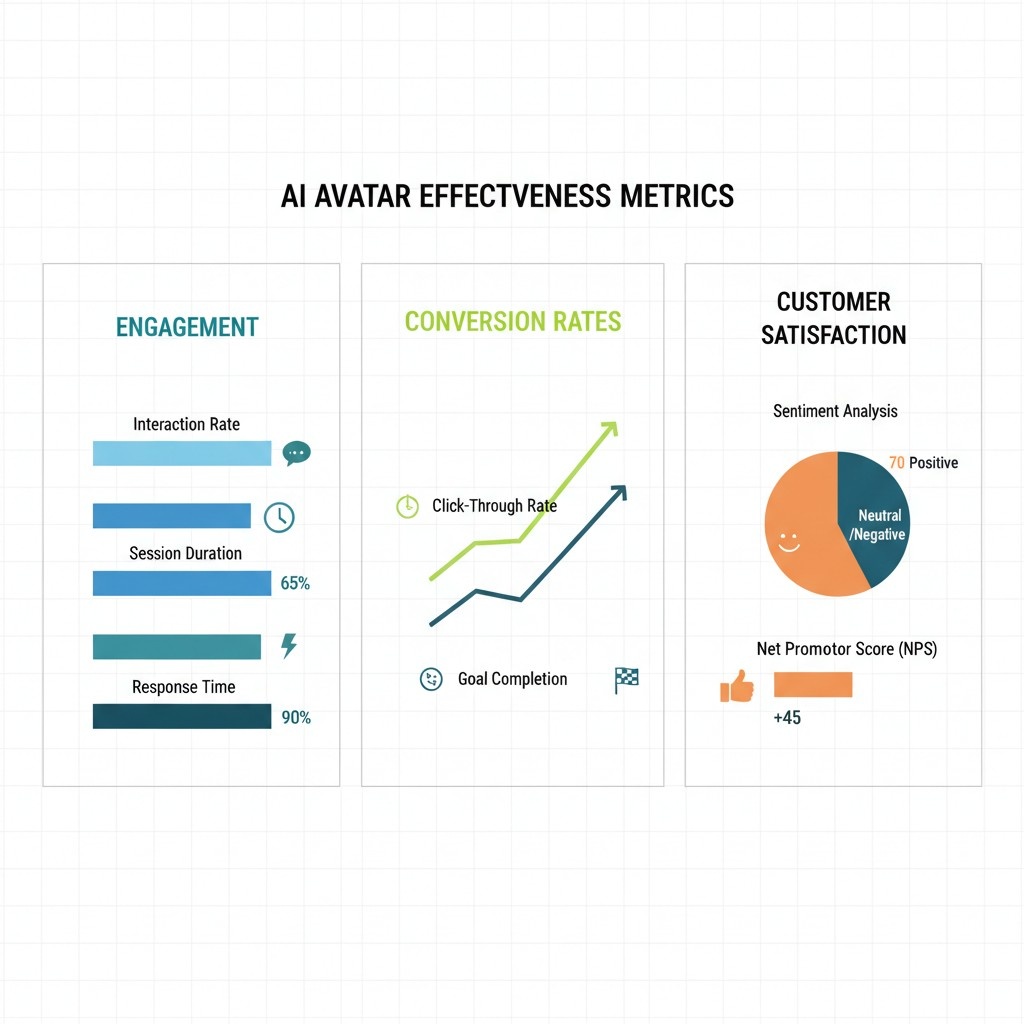 To measure the effectiveness of AI avatars, you must track specific KPIs across engagement, conversions, customer satisfaction, and cost efficiency.